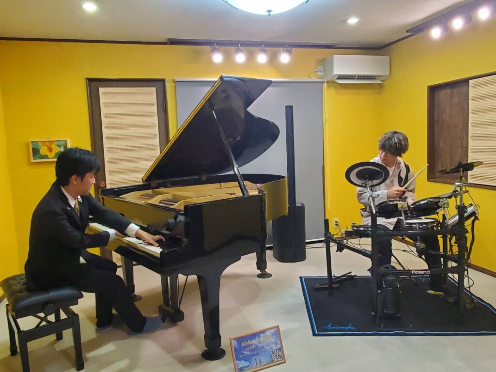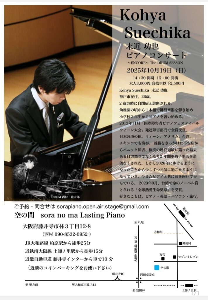 大阪府茨木市にある「尾松ピアノ教室」の発表会のゲストで演奏させて頂きました。自閉症という特性をもつ功也の紹介をさせて頂きながら、ソロ曲「ラ・カンパネラ」など5曲を演奏しました。